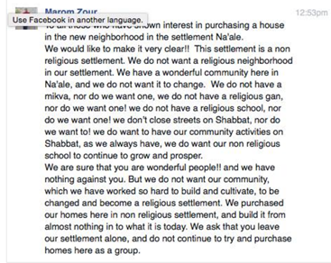So naturally, this person’s children grew up, moved to a different country and, broadly speaking, all of her friend’s children did the same. Now her neighborhood has lots of open real estate and no one to move in – except for the kind of people who believe that a country with so few rational qualities may be worth living in anyway on account of its many esoteric ones. And then Ms. Zour goes on Facebook to rail against the religious for buying up homes in her settlement. But it is a too-little-too-late case of misplaced frustration. Ms. Zour blaming the religious folk for moving in is about as reasonable as castigating poor people for moving in to a suburban American neighborhood after the exodus of enough industry has caused real estate prices to plummet. (Incidentally, it has not gotten past me that the petitioner’s name means “traffic light.” Alias? Ideologically bankrupt parents? Matchmaking mishap? Hard to say.)